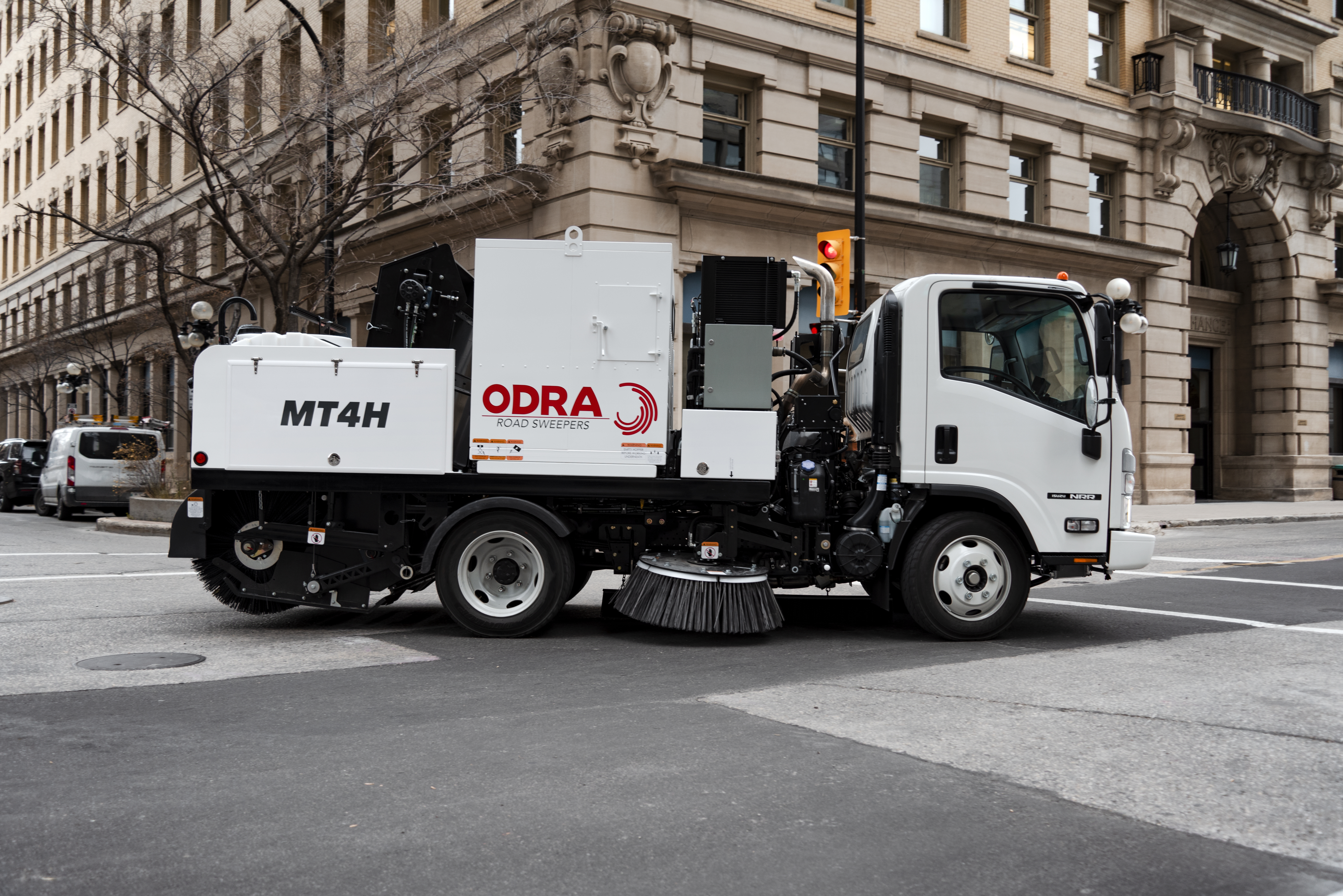 Mechanical sweepers use the main broom to physically sweep up material from the ground onto a mechanical conveyor. The conveyor is approximately 1.5 m wide and is located just in front of the broom. Two side brooms work to dislodge debris from gutters and roadways where it is guided to the main broom. Almost every piece of material moved by the main broom is successfully moved onto conveyor and transported to the hopper. If some material doesn’t reach the conveyor, it drops in the front of the main broom where it has another attempt to be swept onto the conveyor. Because the system mechanically lifts debris, it is better suited for heavy duty applications such as milling, coarse sand, and heavy cleanup.