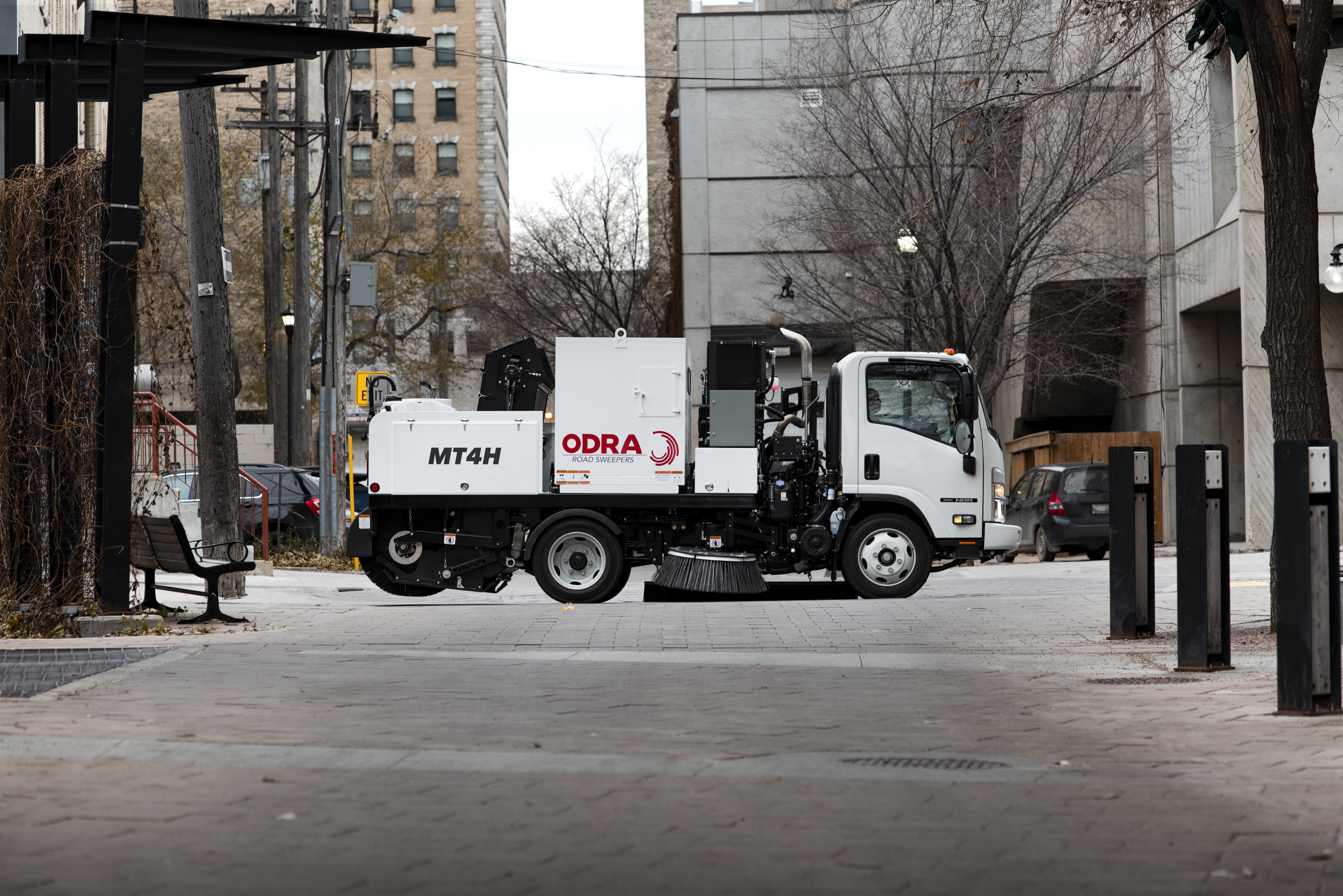 Mechanical sweepers use the main broom to physically sweep up material from the ground onto a mechanical conveyor. The conveyor is approximately 1.5 m wide and is located just in front of the broom. Two side brooms work to dislodge debris from gutters and roadways where it is guided to the main broom. Almost every piece of material moved by the main broom is successfully moved onto conveyor and transported to the hopper. If some material doesn’t reach the conveyor, it drops in the front of the main broom where it has another attempt to be swept onto the conveyor. Because the system mechanically lifts debris, it is better suited for heavy duty applications such as milling, coarse sand, and heavy cleanup.
